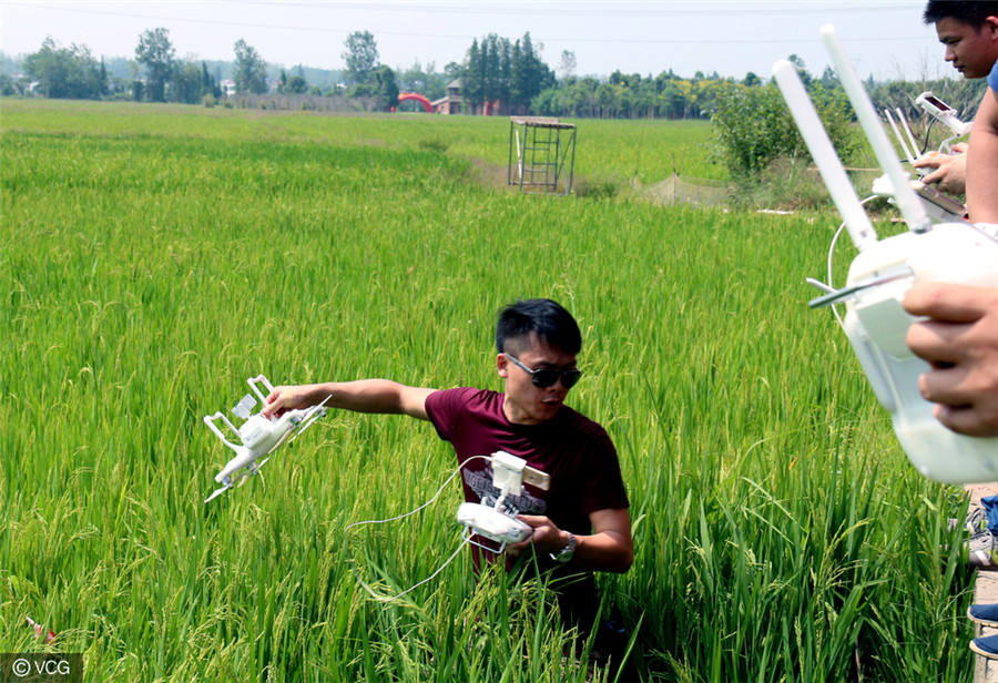Bei so dichtem Flugverkehr sind Unfälle schwer zu vermeiden. Ein junger Mann hebt seine Drohne auf, die in einem Reisfeld abgestürzt ist.