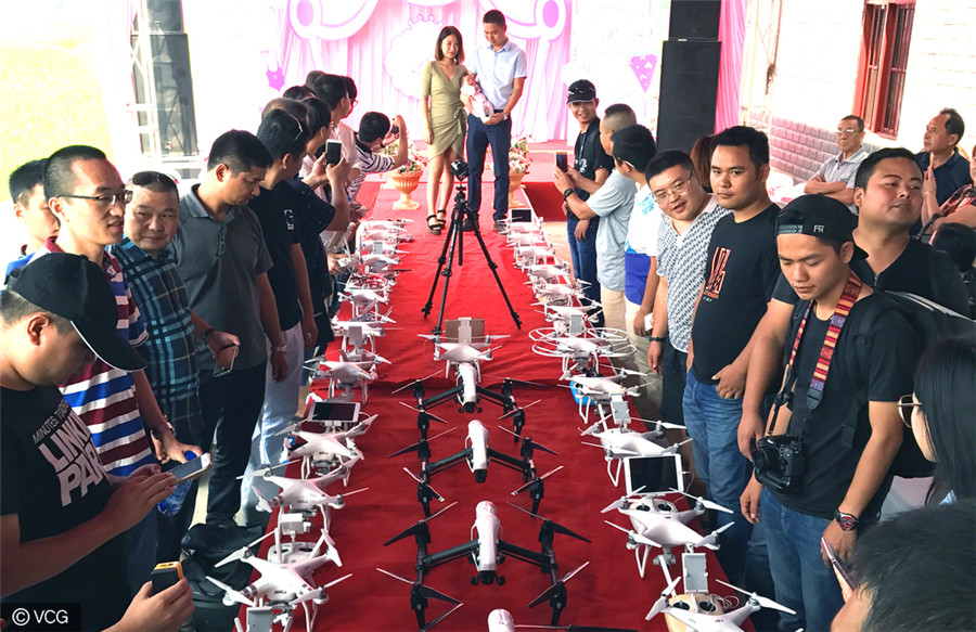 Diese großzügige Feier wurde in Jiaohe in der südchinesischen Provinz Hunan veranstaltet. Dazu wurde ein lokaler Verband der Flug-Liebhaber eingeladen. Vor dem Bankett ließen sie die ferngesteuerten Drohnen über dem Festplatz schweben, um die wichtigen Momente festzuhalten.