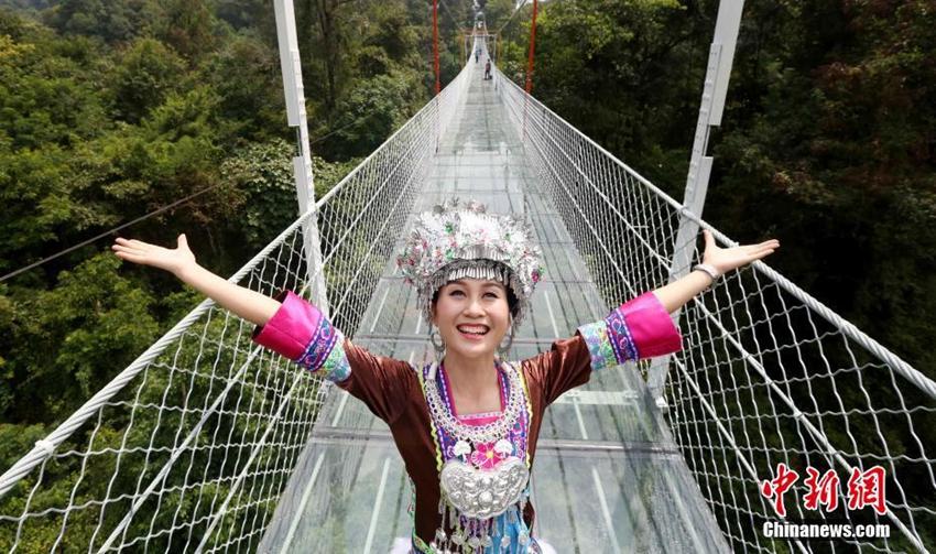 Einige Mädchen der Miao-Nationalität probieren die Glasbrücke aus.