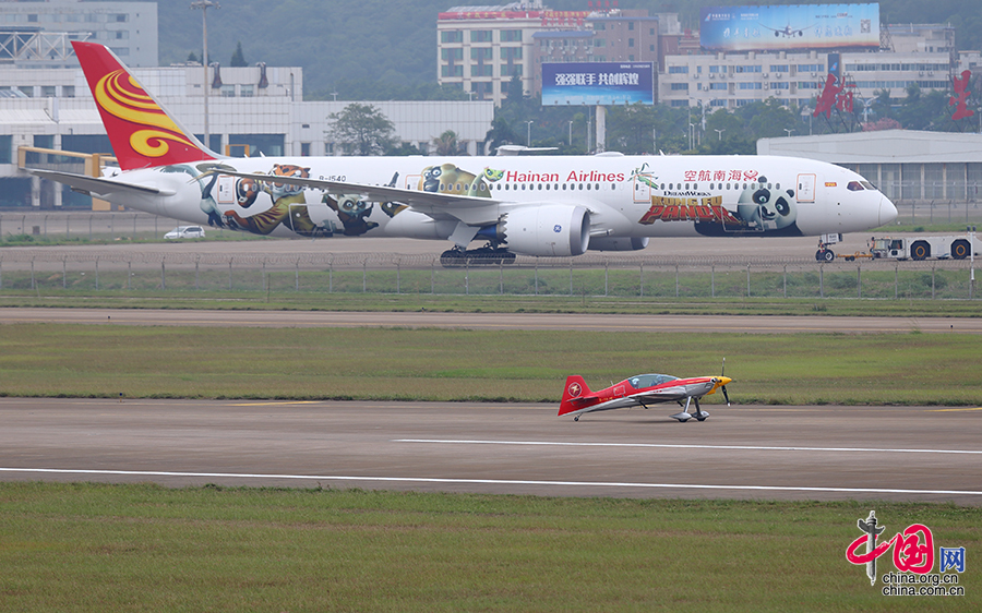 Die Kunstflugstaffel „Blitz“ von der Jilin Aviation Academy steuert ein Kunstflugzeug „China Red XA42“ an ein Passagierflugzeug Boeing 787-9 von der Hainan Airlines vorbei, das mit Bildern von „Kongfu Panda“ bemalt wird.
