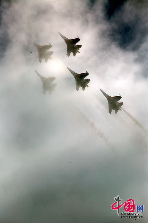 Fünf Suchoi Su-27 der russischen Kunstflugstaffel „Russkije Withasi“ (Russische Recken) fliegen in die Wolken.