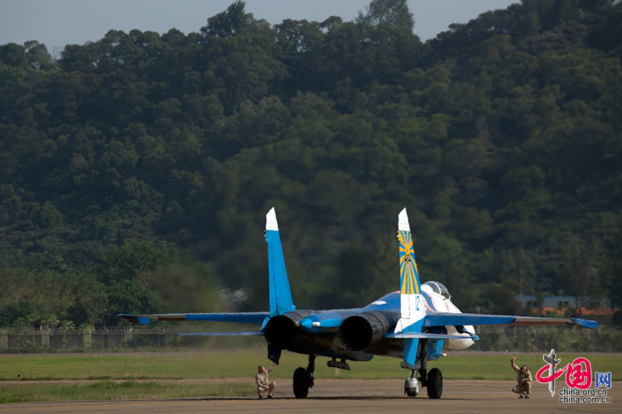 Ein Suchoi Su-27 der russischen Kunstflugstaffel „Russkije Withasi“ (Russische Recken) verlässt den Flugzeugabstellplatz.