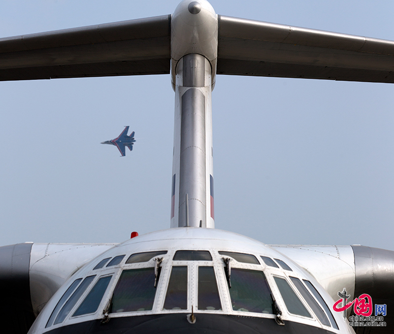 Ein Suchoi Su-27 der russischen Kunstflugstaffel „Russkije Withasi“ (Russische Recken) fliegt an einem Iljuschin Il-76, einem schweren Transportflugzeug, vorbei.
