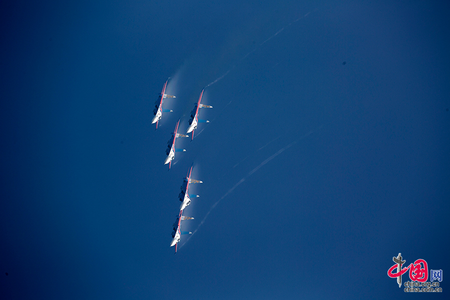 Fünf Suchoi Su-27 der russischen Kunstflugstaffel „Russkije Withasi“ (Russische Recken) im Sturzflug.