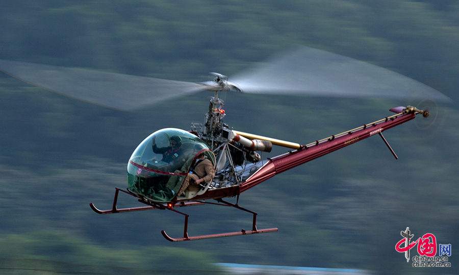 Ein Hiller UH-12E3-Hubschrauber fliegt über den Jianwan Flughafen in Zhuhai in der südchinesischen Provinz Guangdong.