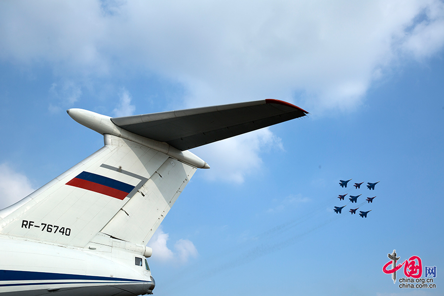 Eine gemeinsame Aufführung der russischen Kunstflugstaffel „Russkije Withasi“ (Russische Recken) und „Strischi“ (Mauersegler).