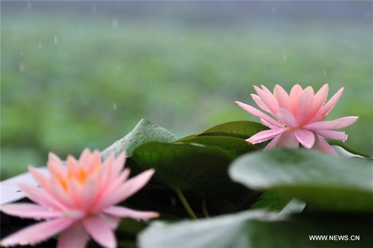 Während der Sommerankunft (Chinesisch: 夏至) erhält die nördliche Hemisphäre die meisten Stunden an Tageslicht.Wasserlilien im Regen in einem Park (Foto 21. Juni 2016).