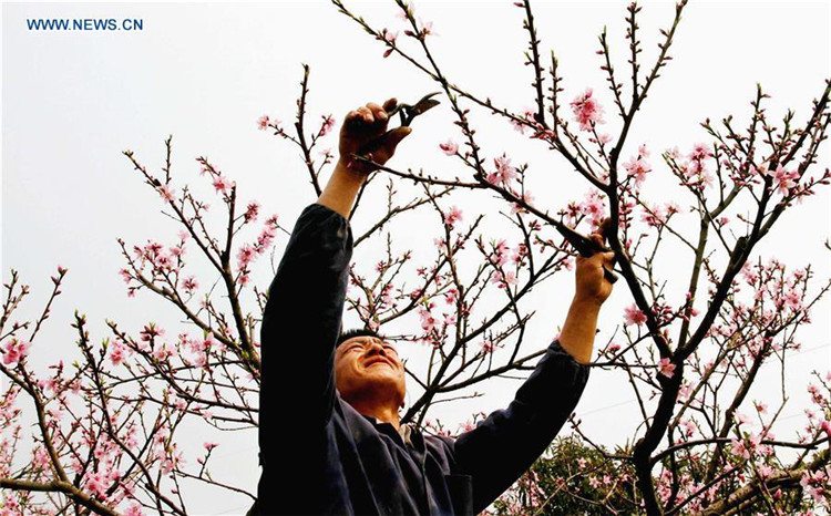 Landwirt Wang Limin schneidet einen Pfirsichbaumast (Foto vom 5. März 2016).