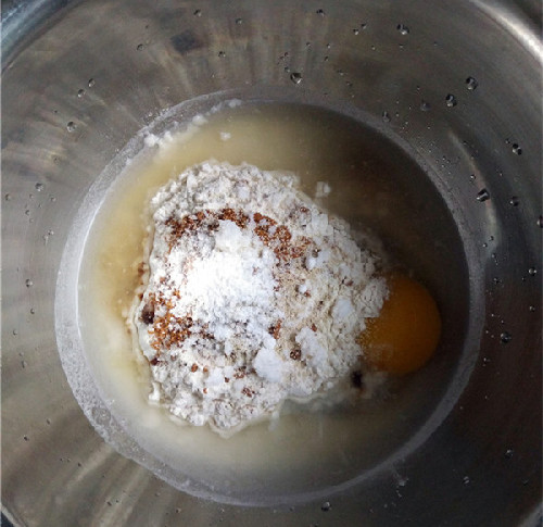 70 Gr. klares Wasser, 1 Ei, 70 Gr. Mehl mit einem niedrigen Eiweißanteil, 7 Gr. brauner Zucker, 12 Gr. Zucker, 1 Gr. Hefe, 30 Gr. Salatsoße, 50 Gr. zerkleinertes, getrocknetes Schweinefleisch, 0,5 Gr. Soda, 0,1 Gr. Salz