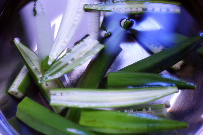 2 Ausreichend klares Wasser in einen Topf geben und aufkochen. Die Orka hineingeben und garen. Danach die Okra schnell mit Eiswasser abschrecken, damit sie abkühlen. Anschließend die kalten Orka im Kühlschrank aufbewahren.