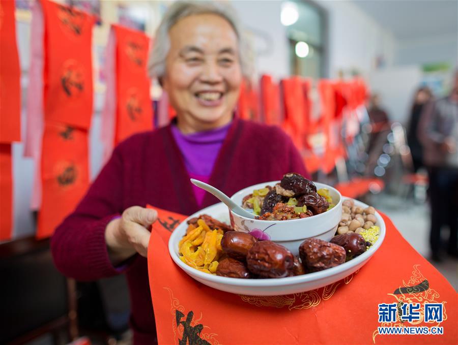 Das Autonome Gebiet Innere Mongolei: Am Mittwoch hat ein Wohnvertel in der Stadt Hohhot eine feierliche Veranstaltung für das Laba-Fest organisiert. Eine alte Dame präsentiert die nötigen Zutaten für den Brei