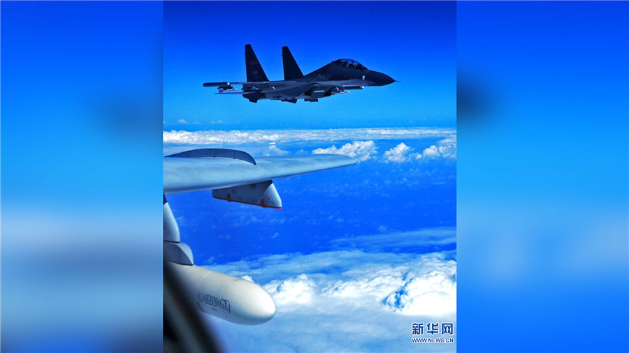 Chinesische Kampfflugzeuge verschiedener Typen fliegen zum Manöver auf hoher See.
