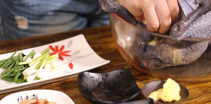 2. Alle Zutaten in den Bauch des Schwarzen Huhnes hineinlegen.