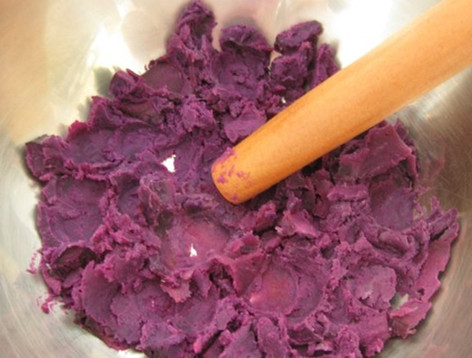 1. Gedämpfte, lila Süßkartoffeln mit einem Nudelholz pürieren