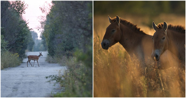Scharen gefährdeter Wildpferde galoppieren auf der freien Wiese, Elche rennen durch dichte Wälder,Wildkaninchen hüpfen zwischen Büschen… das alles sieht nach einem unberührten Naturreservat aus. Doch diese Szenen ereignen sich inmitten des Sperrgebietes von Tschernobyl, in dessen Kernkraftwerk sich 1986 die weltweit schlimmste Reaktorkatastrophe ereignete.