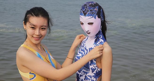 In Qingdao ist am 28. Juni die 7. Generation der "Facekinis" präsentiert worden. Einige Models wurden eingeladen, die neuen Modelle am Strand der ostchinesischen Stadt vorzustellen.