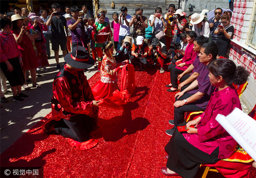 Das Paar fällt vor den Eltern der beiden Seiten auf die Knie nieder.
