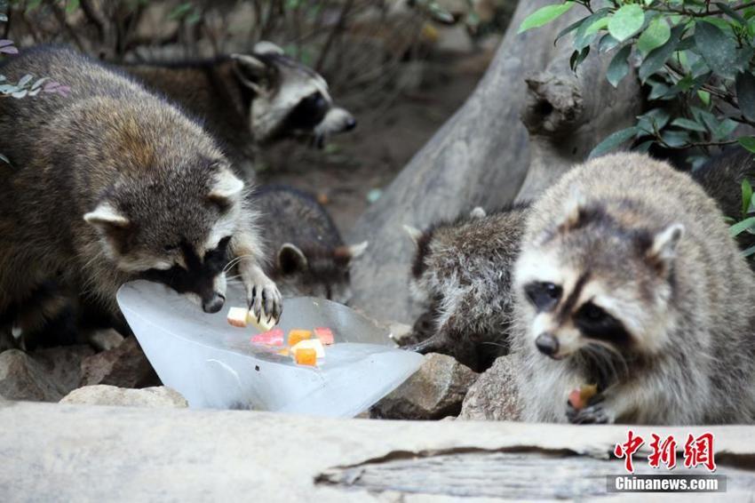 Die Waschbären essen vereistes Obst.