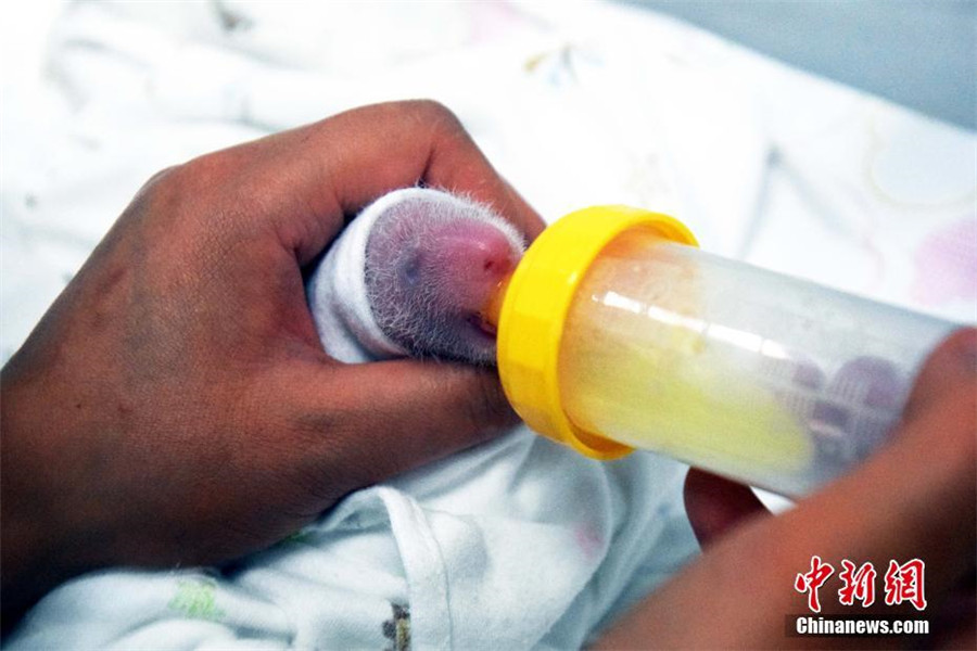 Der Pandasäugling trinkt Milch aus der Flasche