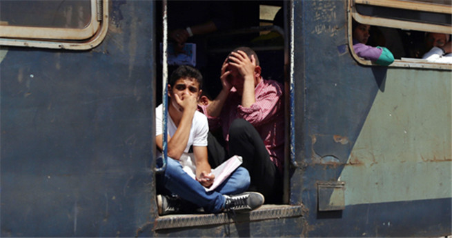 Zwei Fahrgäste in einem Zug, der gerade die ägyptische Hauptstadt Kairo verlässt.