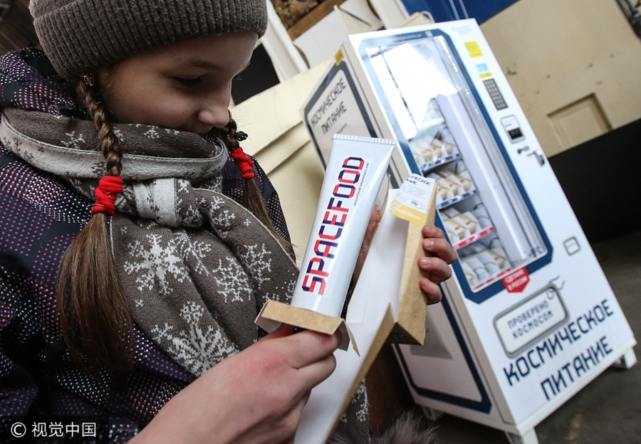 Im Februar 2015 kauft eine Frau Astronautennahrung aus einem Automaten. Der Automat bietet elf Sorten von Weltraumlebensmitteln. Dazu zählen Hauptgerichte, Beilagen, Nachspeisen – und zwar alles aus der Tube.