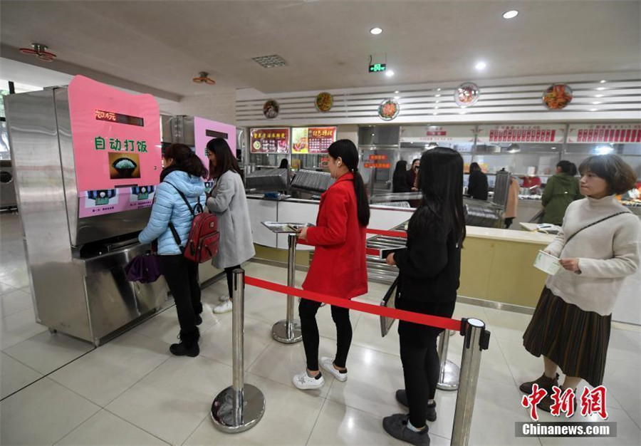 Im März 2017 stehen Studenten der Pädagogischen Hochschule von Fujian vor einem Reisautomaten Schlange. Nachdem die Studenten das Tablett in die Vorrichtung hineingesteckt und mit der Mensakarte bezahlt haben, spuckt der Automat ein rechteckiges Stück Reis aus. Die Maschine hat Reis für 1000 Personen. In 30 Sekunden schafft sie zehn Portionen.