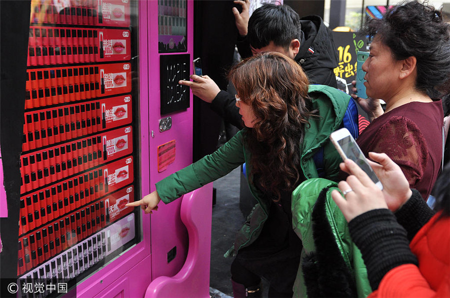 Frauen stehen in einer Schlange, um Lippenstifte aus einem Automaten in Shenyang (Liaoning Provinz) zu kaufen. Im Februar 2016 vertrieb eine Lippenstiftmarke ihre Produkte für einen Yuan (0,13 Euro) aus dem Automaten.