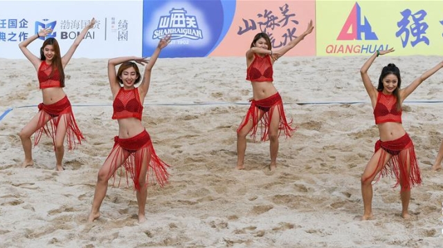 Während der 13. chinesischen Nationalspiele in Tianjin verleihen die Cheerleader dem Beachvolleyballspiel einen besonderen Charme.