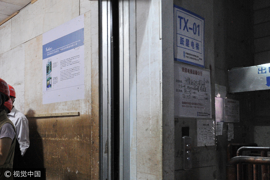 Arbeiter warten auf den Fahrstuhl, damit sie in höheren Stockwerken arbeiten können.