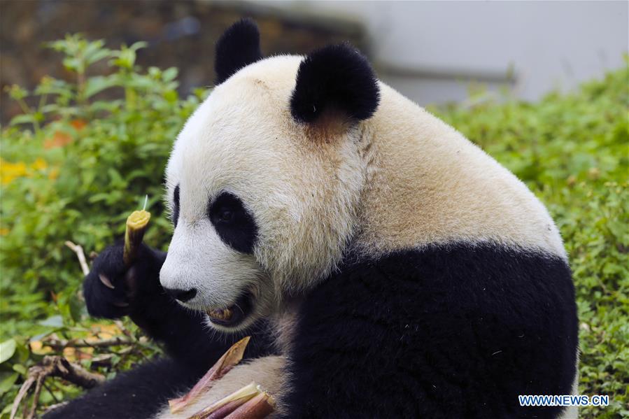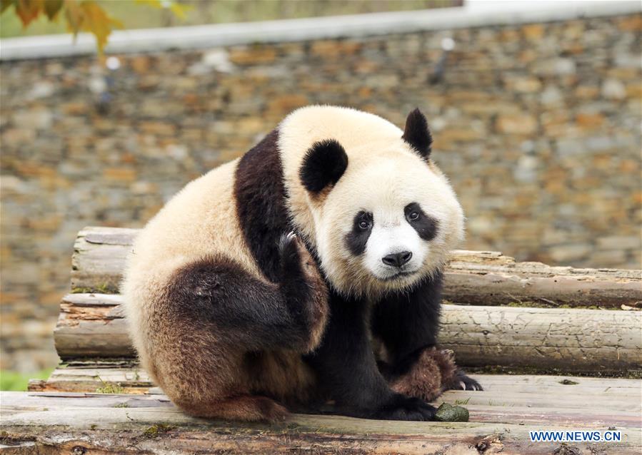 Ein Riesenpanda in der Schutzbasis Shenshuping im Naturreservat Wolong in der südwestchinesischen Provinz Sichuan frisst Bambus (Foto vom 20. Oktober 2017). Die Panda-Schutzbasis Shenshuping ist nach einem Erdbeben von 2008 wiederaufgebaut worden, und über 50 Riesenpandas leben dort, wovon 19 in diesem Jahr geboren sind. (Xinhua/Zhang Fan)