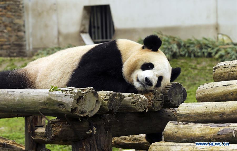 Ein Riesenpanda in der Schutzbasis Shenshuping im Naturreservat Wolong in der südwestchinesischen Provinz Sichuan ruht sich aus (Foto vom 20. Oktober 2017).