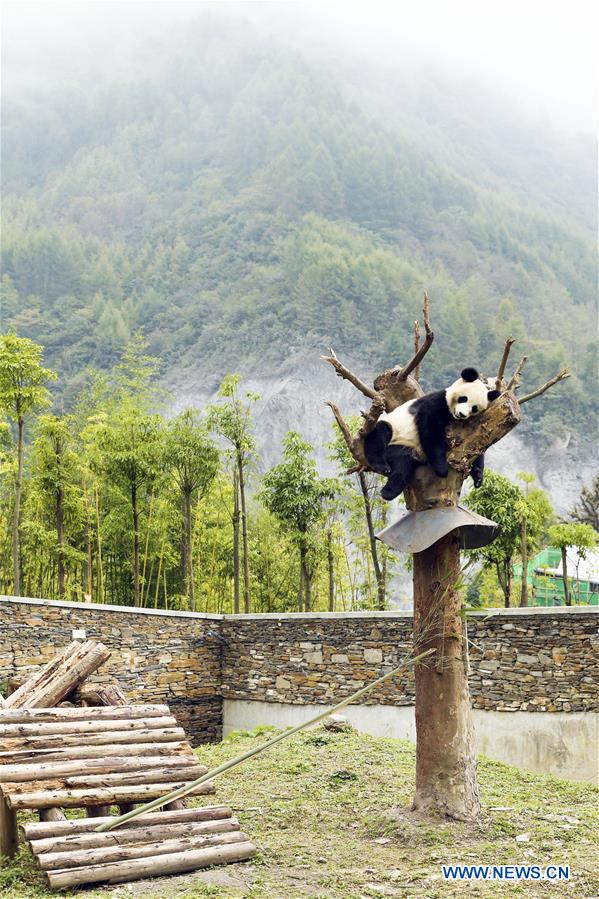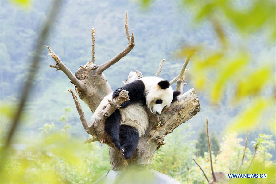 Ein Riesenpanda in der Schutzbasis Shenshuping im Naturreservat Wolong in der südwestchinesischen Provinz Sichuan ruht sich auf einem Baum aus (Foto vom 20. Oktober 2017).