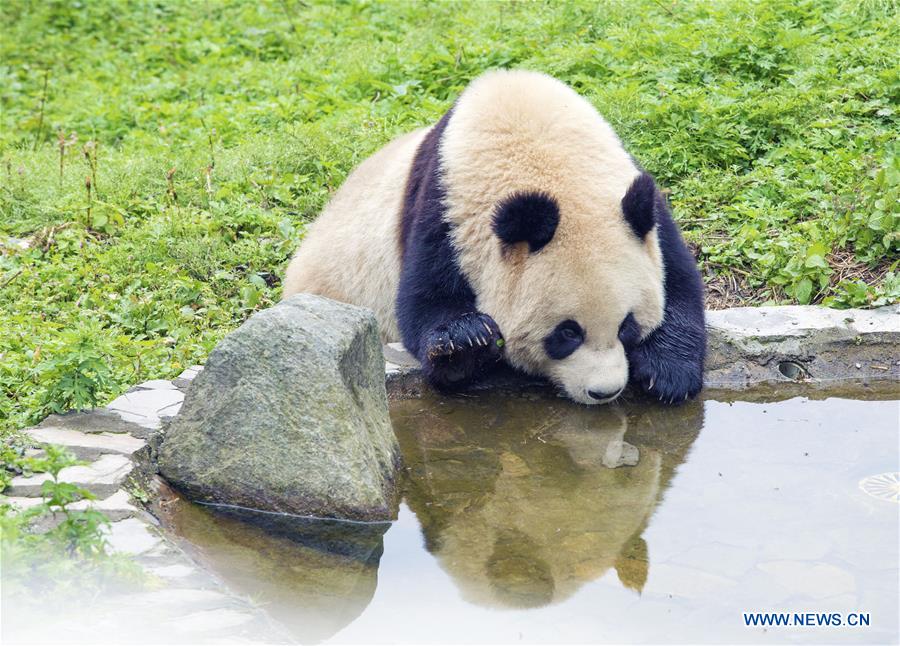 Ein Riesenpanda in der Schutzbasis Shenshuping im Naturreservat Wolong in der südwestchinesischen Provinz Sichuan trinkt Wasser (Foto vom 20. Oktober 2017).
