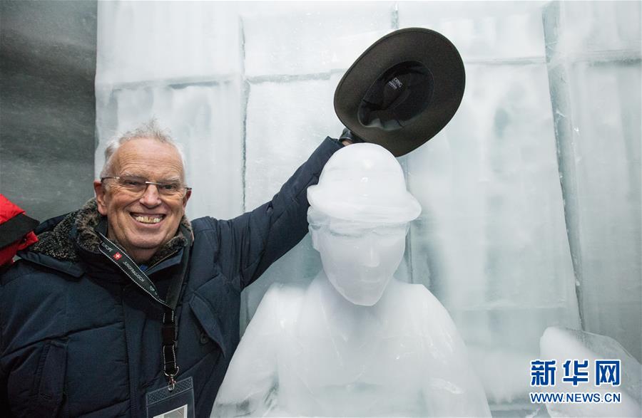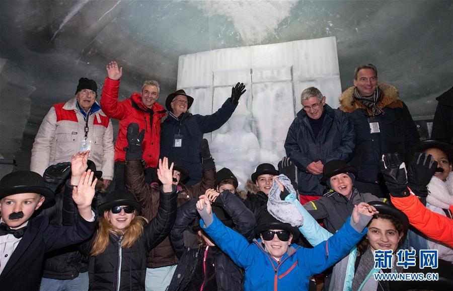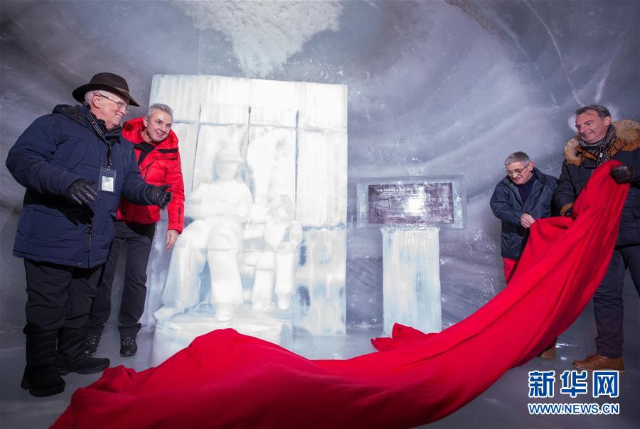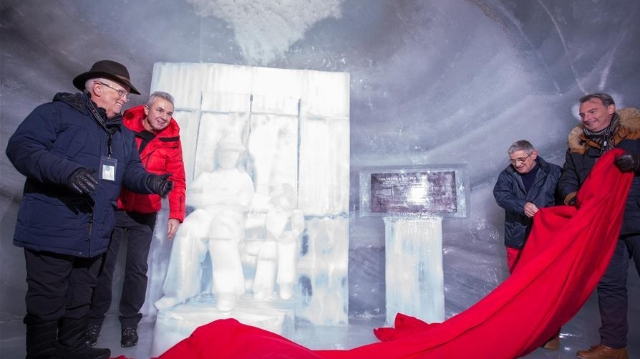 Der britische Künstler John Doubleday (1. v. r) und Charlie Chaplins Sohn Eugene Chaplin (1. v. l) enthüllen im Eispalast auf dem „Top of Europe“ die Eisstatue von Charlie Chaplin. (Foto: Xu Jinquan/Xinhua)