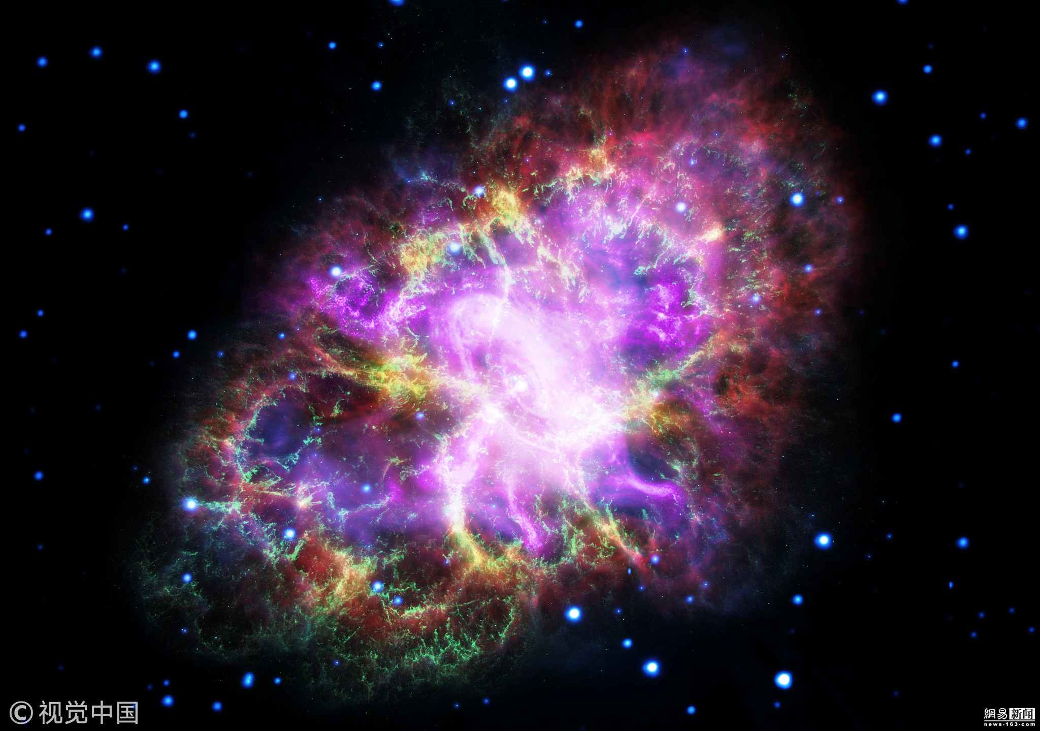 Dieses Bild des Krebsnebels, eines Supernovaüberrests, ist aus Daten von fünf Teleskopen entstanden, die fast die gesamte Bandbreite des elektromagnetischen Spektrums abdecken. (Foto vom 30. Mai)