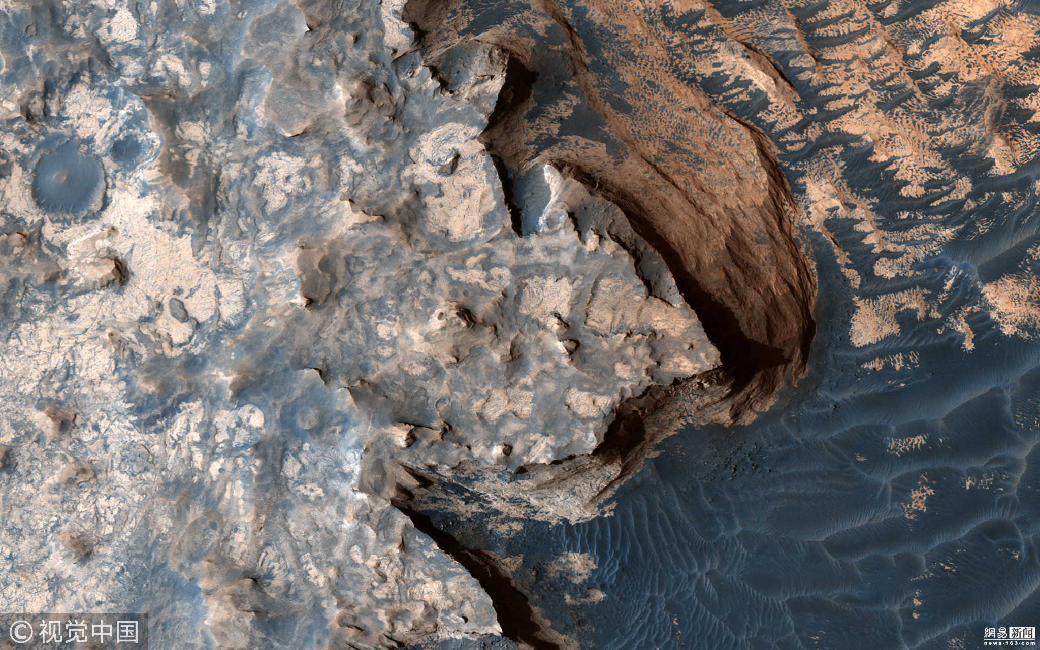 Ein von der HiRISE-Kamera (High Resolution Imaging Science Experiment) aufgenommenes Bild der NASA zeigt den Frühling in der nördlichen Hemisphäre des Mars. Schnee aus Kohlendioxid (Trockeneis) bedeckt die Dünen.