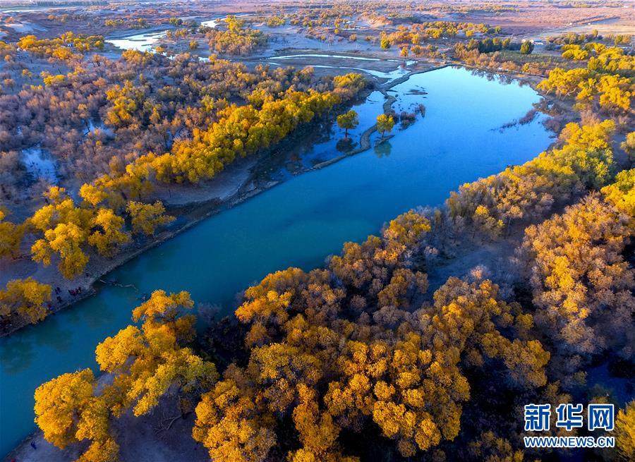 Der Wald von verschiedenblättrigen Pappeln in dem Autonomen Gebiet der Inneren Mongolei glänzt im Herbst (Foto vom 13. Oktober 2017).