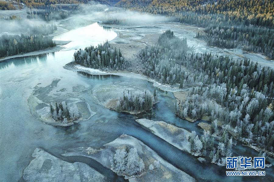 Im Spätherbst sehen die silbernen Flüsse und Bäume im Landschaftsgebiet von Kanas in dem Autonomen Gebiet Xinjiang aus wie in einem Märchenland.