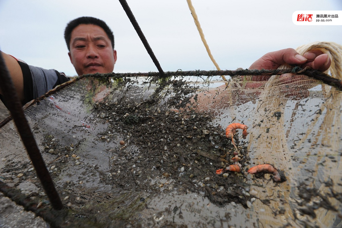 Auch die Garnelenzüchter in der Nachbarprovinz Hebei erlitten erhebliche Verluste. Ein Fischer zeigt am 13. September 2011 abgefischte, tote Garnelen und ungefressene Beute aus einem Teich.