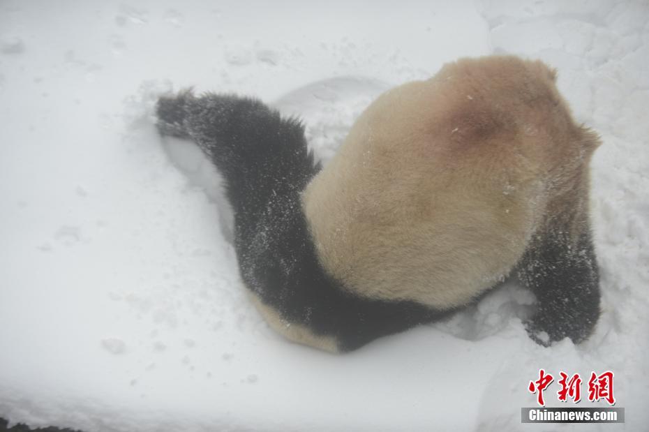 Ein Panda wälzt sich im Tierpark von Yangzhou am Sonntag voller Freude im Schnee.