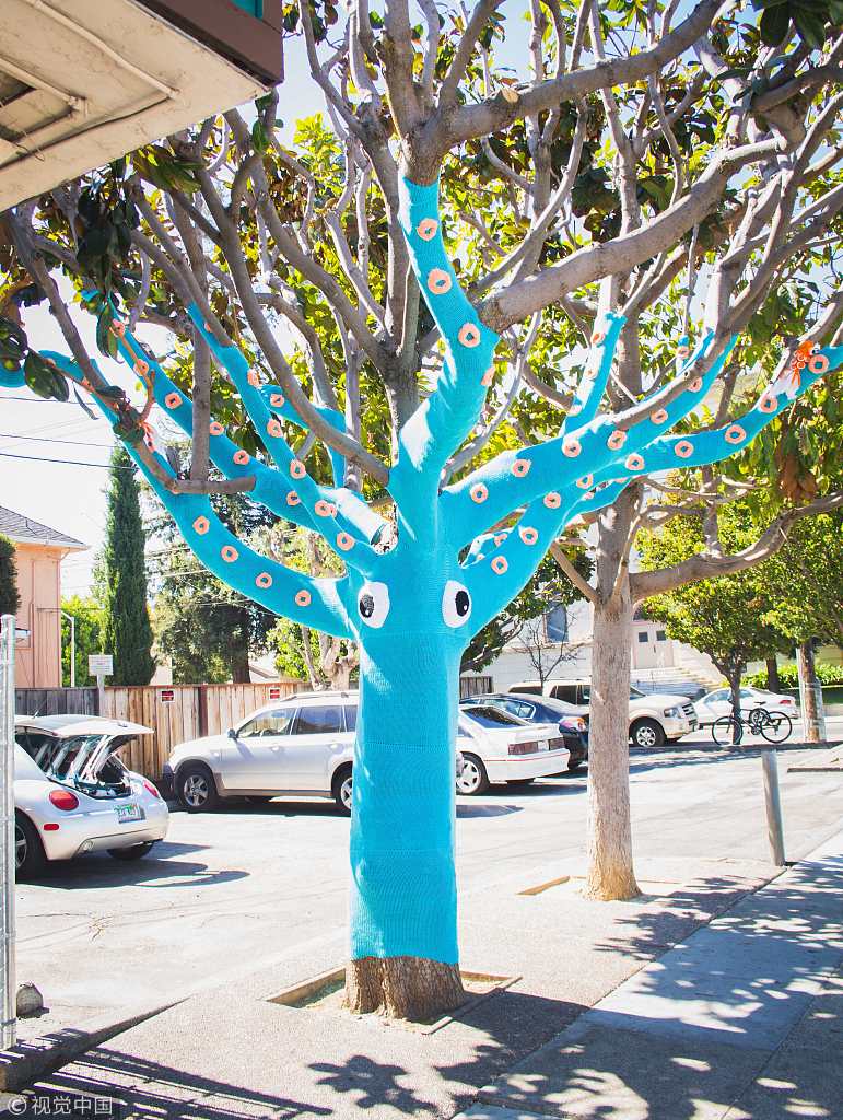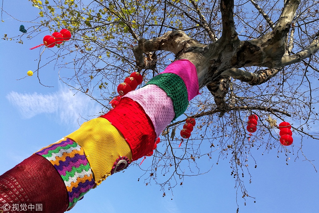Am 21. Januar 2017 fiel die Temperatur im ostchinesischen Wuxi unter Null Grad Celsius. Eine Gruppe Strickerei-Liebhaber der Stadt hat für die Bäume farbige „Pullover“ gestrickt.