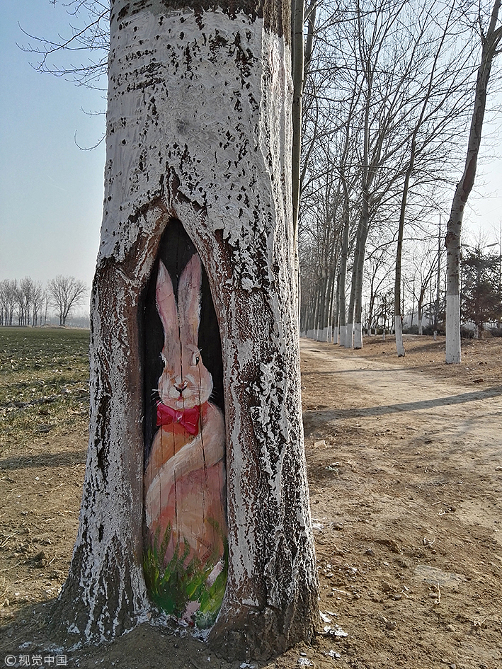 Ein Mann und seine Tochter malten im Februar vergangenen Jahres lustige Tierbilder an die Baumhöhlen und Baumnarben. So verabschieden sie sich von den Winterferien und begrüßen den Frühling.