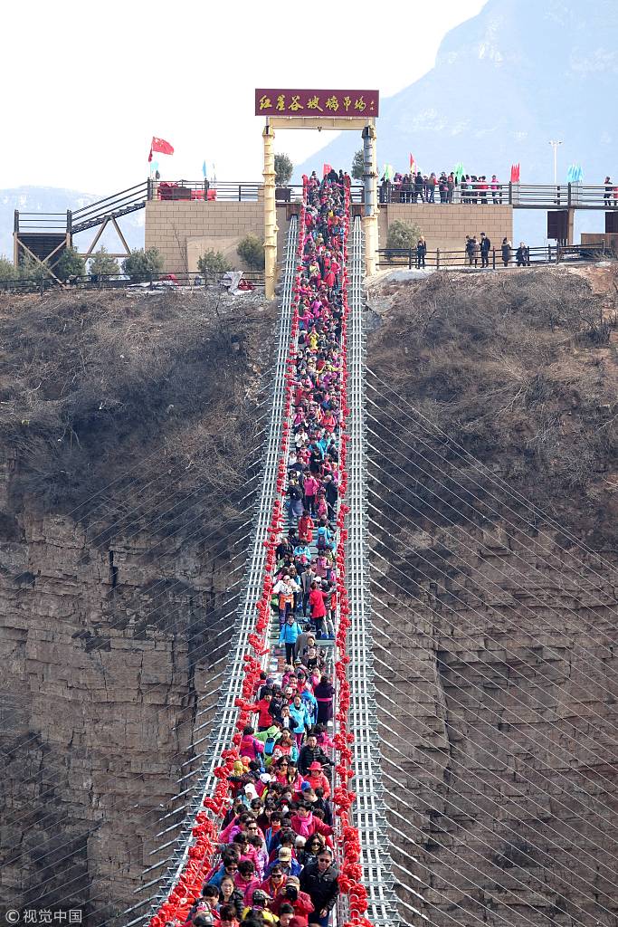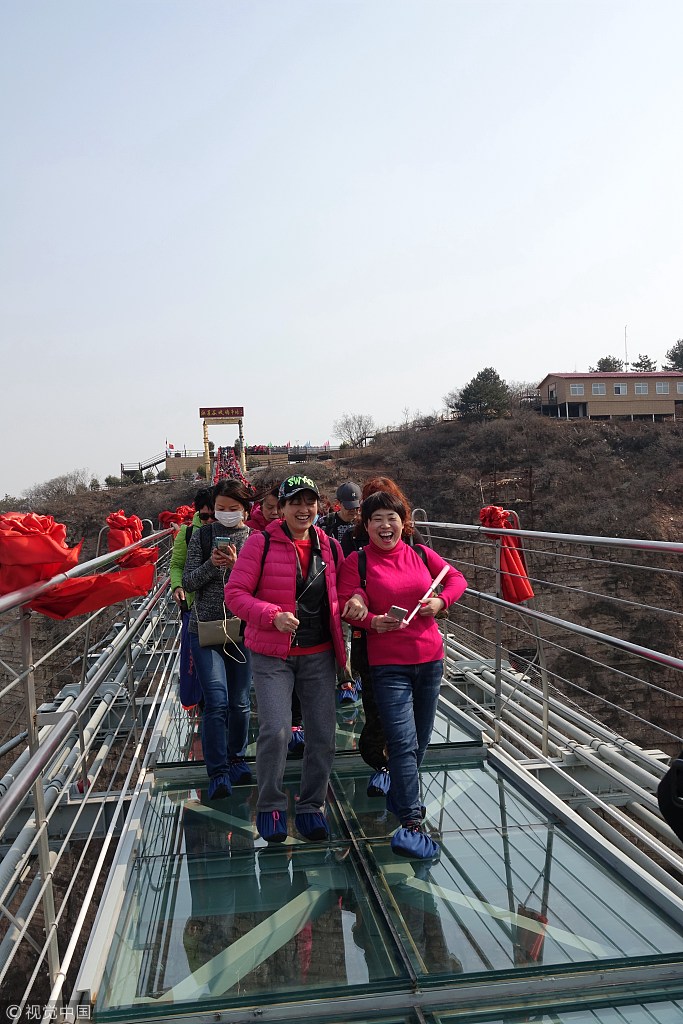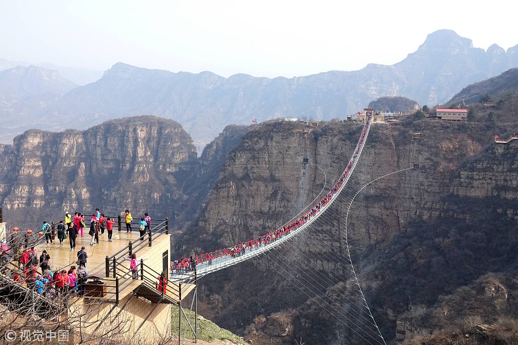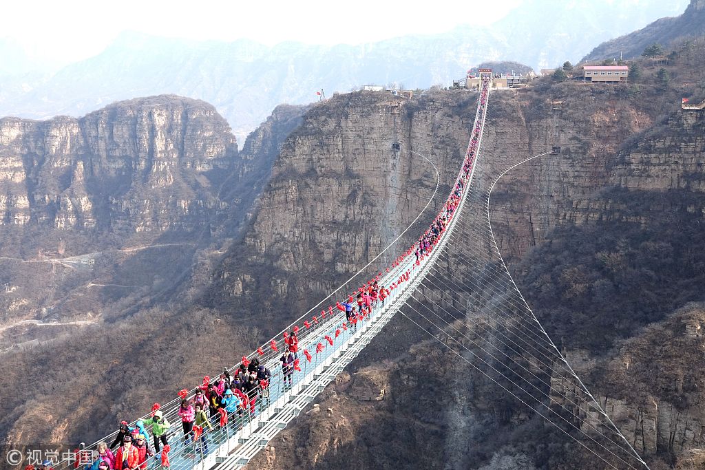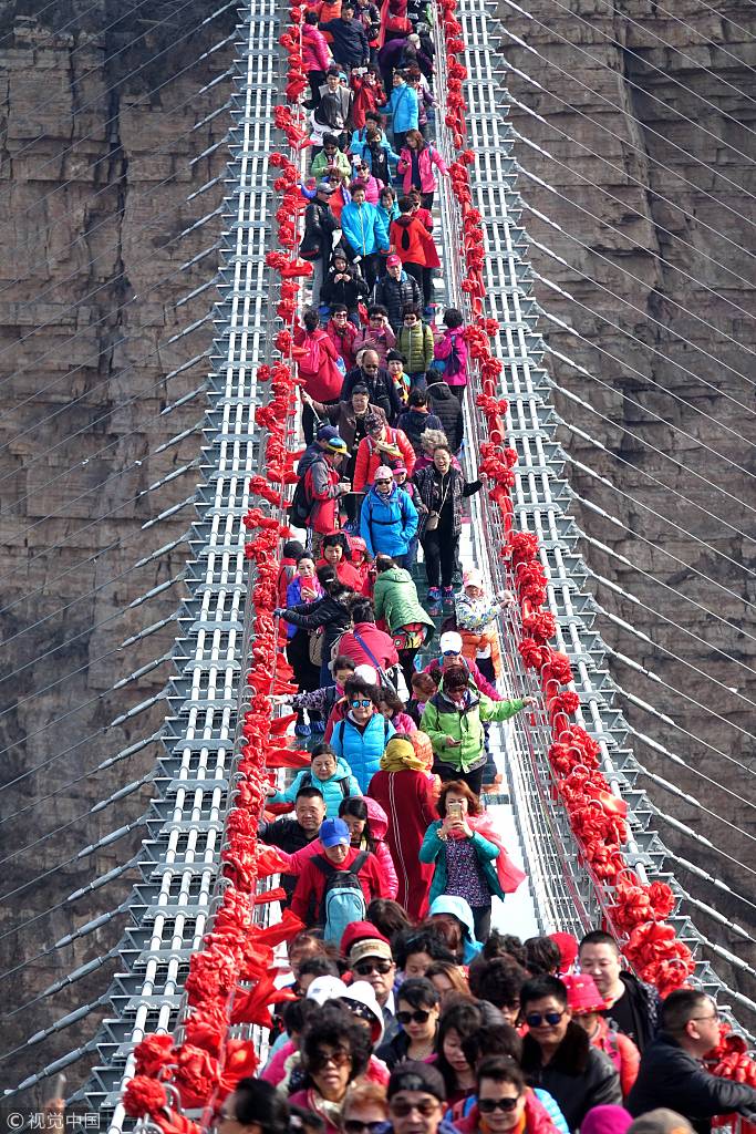 Die hängende Glasbrücke über dem Hongya-Tal im Kreis Pingshan in Hebei hat am Montag zahlreiche Besucher empfangen.