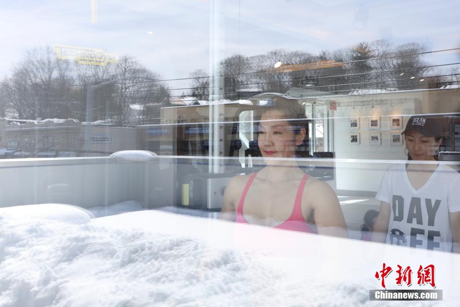 Cao zeigt einer Kundin die richtigen Bewegungen. Draußen ist eine schöne Schneelandschaft in New York. Hier hat Cao diese Filiale von ihrem Fitness-Center gegründet.