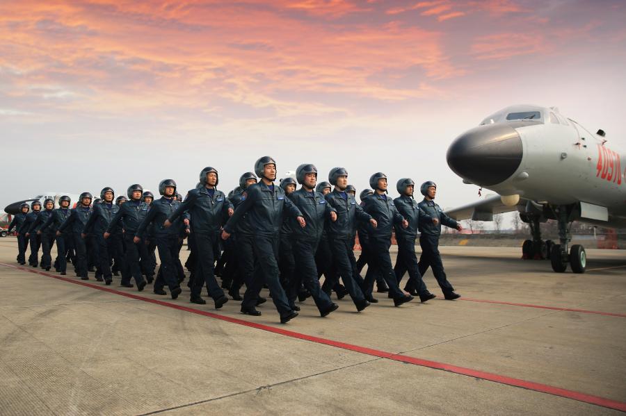 Piloten der Luftwaffe gehen vor einer Kampfübung mit H-6K Bombern auf dem Flughafen in Formation.