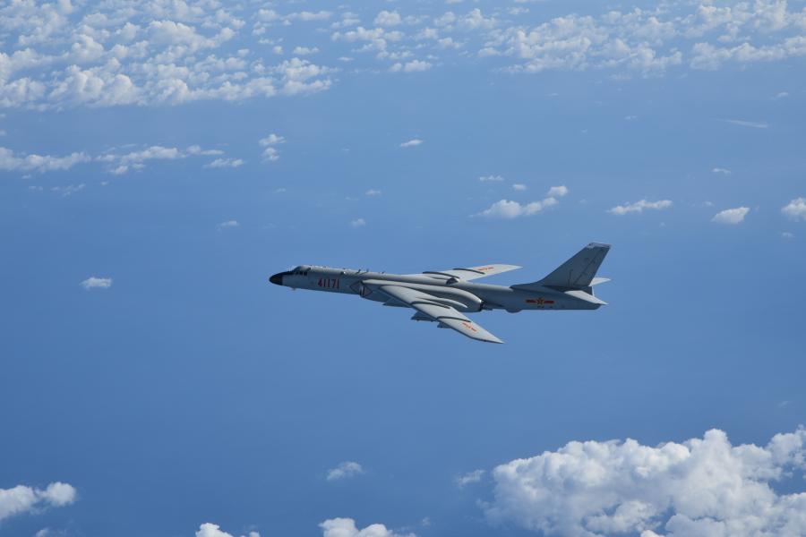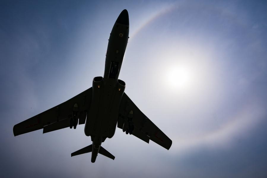 Ein H-6K Bomber fliegt durch den Himmel.