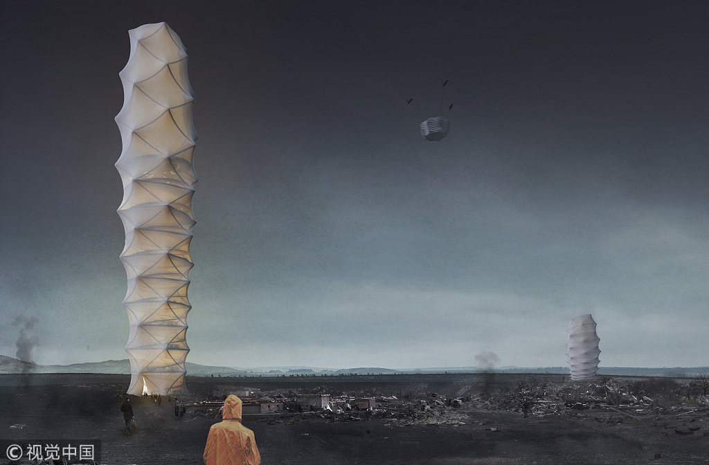 Das Projekt ist ein faltbarer Wolkenkratzer, der von Origami inspiriert wurde und leicht in Katastrophengebietetransportiert und eingesetzt werden kann.