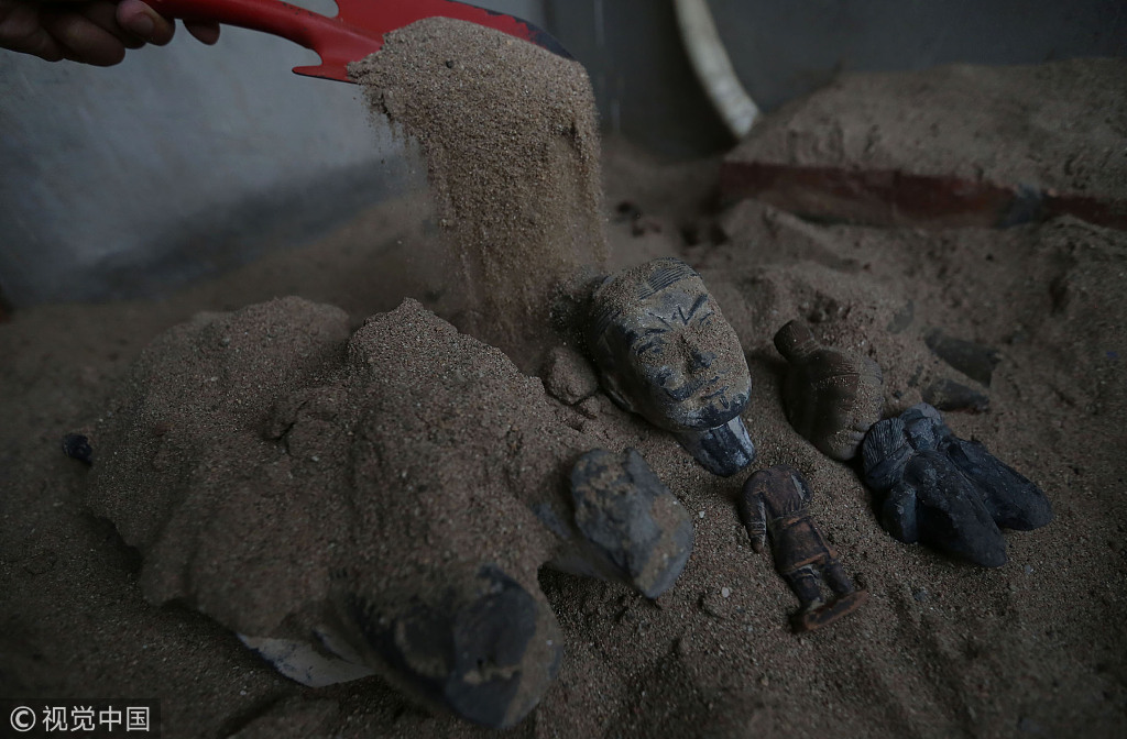 Es gibt in dem Zimmer noch eine Kinderecke, wo Kinder mit ihren Schaufeln im Sand Terrakotta-Krieger-Figürchen suchen.