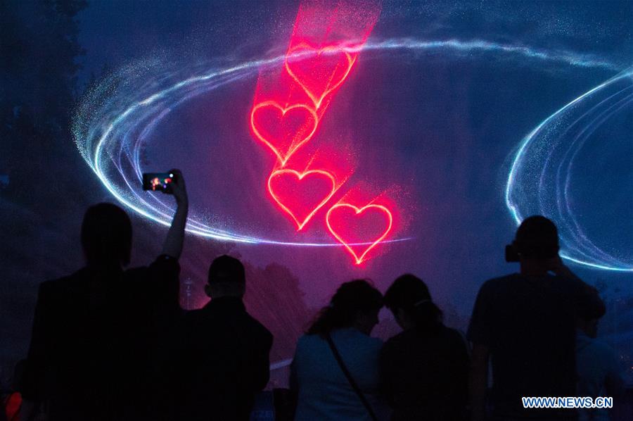 Besucher sehen sich eine Laser-Licht-Show im Multimedia Fountain Park in Warschau in Polen an (Foto vom 22. Juni 2018).