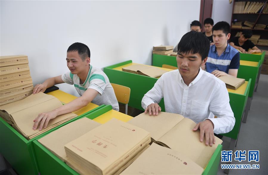 Im Unterricht lesen Sun (vorne rechts), Fan (vorne links) und die anderen Mitstudenten ihre Lehrbücher mit Blindenschriften.
